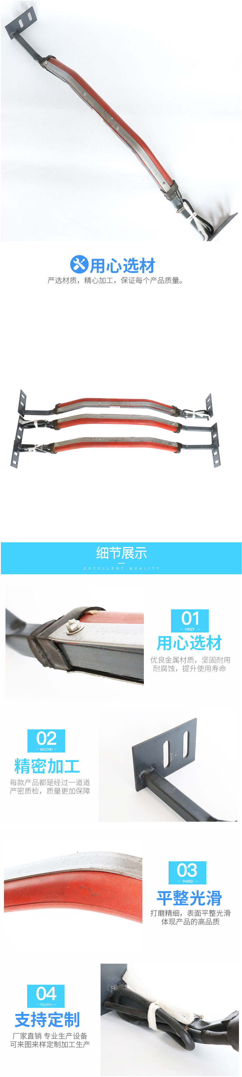 1.ZL系列縱向撕裂監(jiān)測裝置由感知器和控制線路兩部分組成。感知器是縱向撕裂的檢測元件,當(dāng)帶式輸送機輸送帶被異料穿透后,隨著輸送帶運行帶動異物使感知器受到擠壓,或當(dāng)溜槽出料口與輸送帶之間因物料堵塞而擠壓布置在出料口的感知器時,感知器均能靈敏可靠的檢測出輸送帶撕裂信號并輸出開關(guān)量,發(fā)出停機信號??刂凭€路具有延時功能。