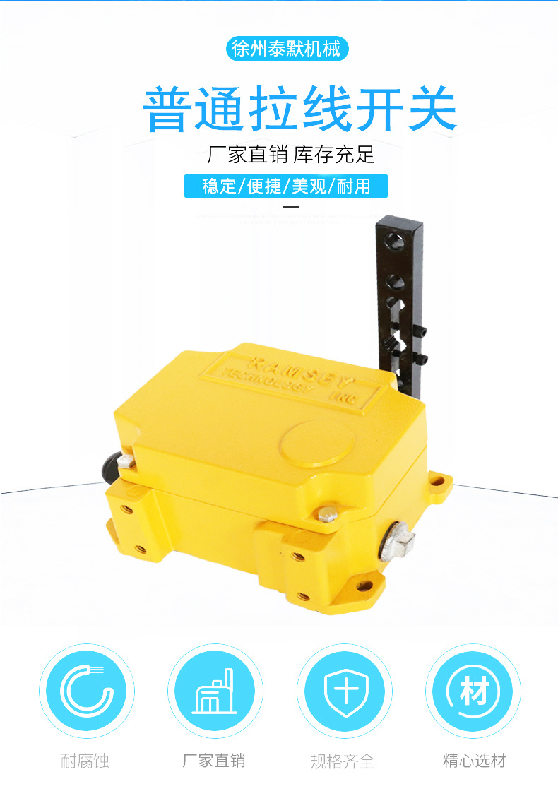 當膠帶運輸現(xiàn)場發(fā)生緊急事故時,拉動系在吊耳上的鋼絲繩,使機內(nèi)的滑塊與開關(guān)作用,發(fā)出停機信號。松開鋼絲繩按下復(fù)位杠后方可復(fù)位